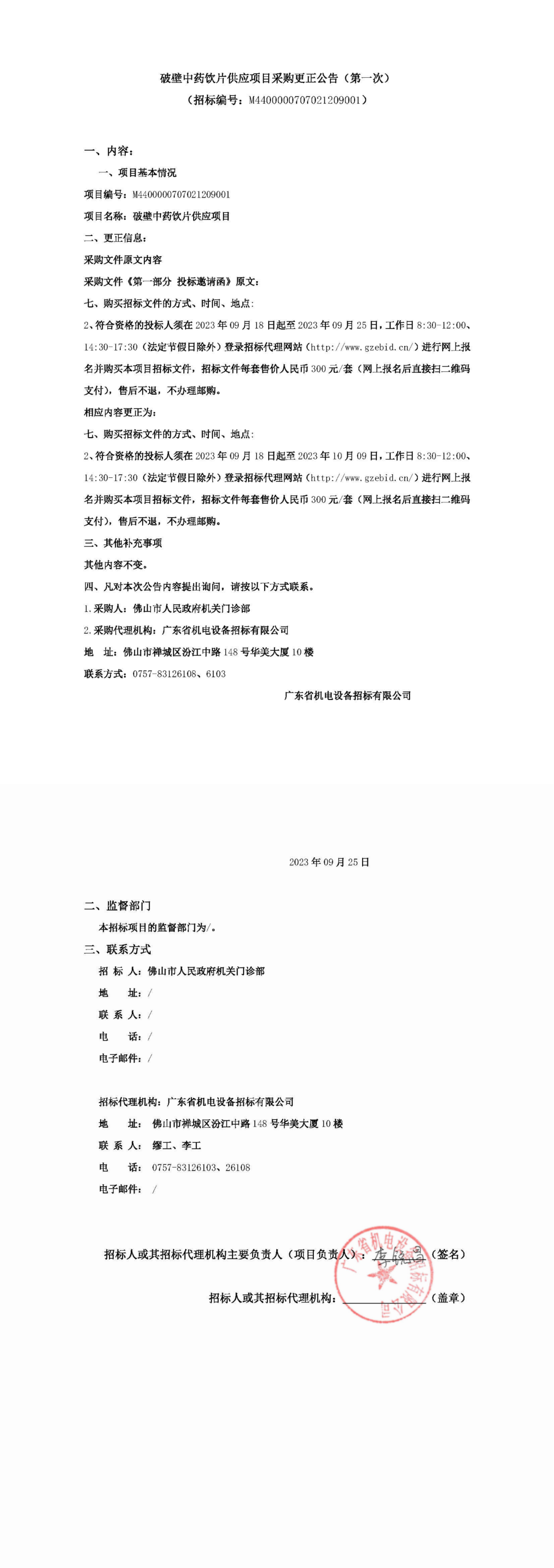 广东省佛山市人民政府机关门诊部破壁中药饮片供应项目采购更正公告(第一次)