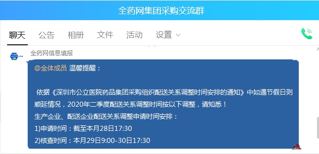 依据《深圳市公立医院药品集团采购组织配送关系调整时间安排的通知》中如遇节假日则顺延情况,2020年二季度配送关系调整时间按以下调整,请知悉!